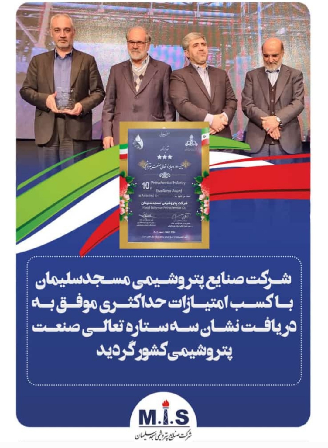 به گزارش پایگاه خبری ایرانیان به نقل از روابط عمومی و امور بین الملل شرکت صنایع پتروشیمی مسجدسلیمان، دهمين دوره جايزه تعالي صنعت پتروشيمي كشور با حضور وزير تعاون ، کار و رفاه اجتماعي، مديرعامل شركت ملي صنايع پتروشيمي، معاونين وزير و ديگر مديران ارشد صنعت پتروشيمي در سالن همايش هاي صدا و سيما برگزار و اين شركت موفق به دريافت تقديرنامه سه ستاره گرديد.