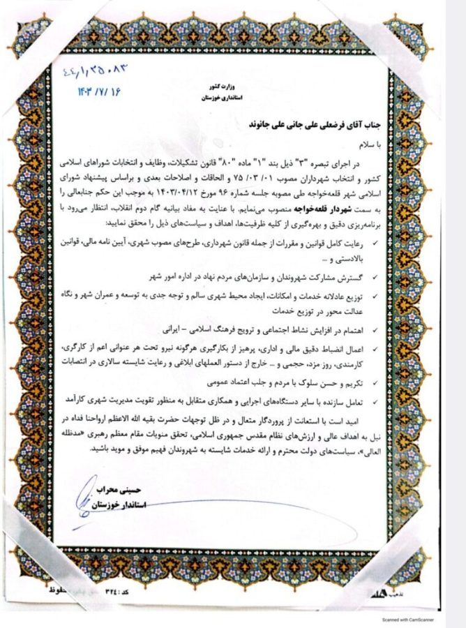 طی حکمی از سوی حسینی محراب استاندار خوزستان ، فرضعلی علیجانی بعنوان شهردار قلعه خواجه منصوب شد.