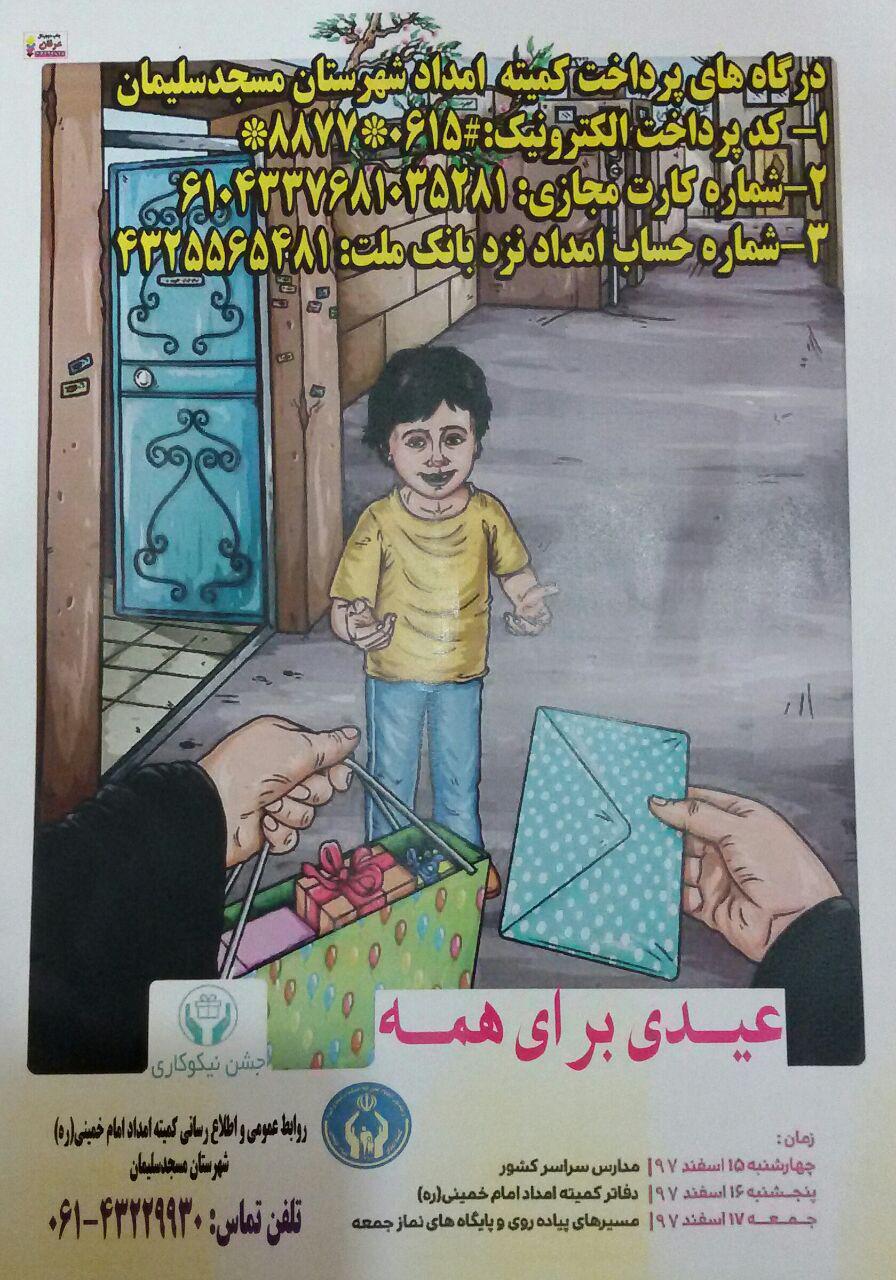 منصورنیا خاطر نشان کرد: یکی از اهداف اصلی و شعارهای کمیته امداد، ترویج فرهنگ احسان و نیکوکاری در بین مردم است، بهمین منظور در روز ۵ شنبه پایگاه های کمیته امداد در سطح خیابان اصلی شهر مسجدسلیمان منتظر دستان گرم و پُر مهر همه مسئولین و مردم خواهند بود تا یاری دهنده مستضعفین شهرشان باشند و ضمن تقویت این سنّت حسنه، همشهریان محروم و کم بضاعت شان را در روزهای پایانی سال تنها نگذراند.