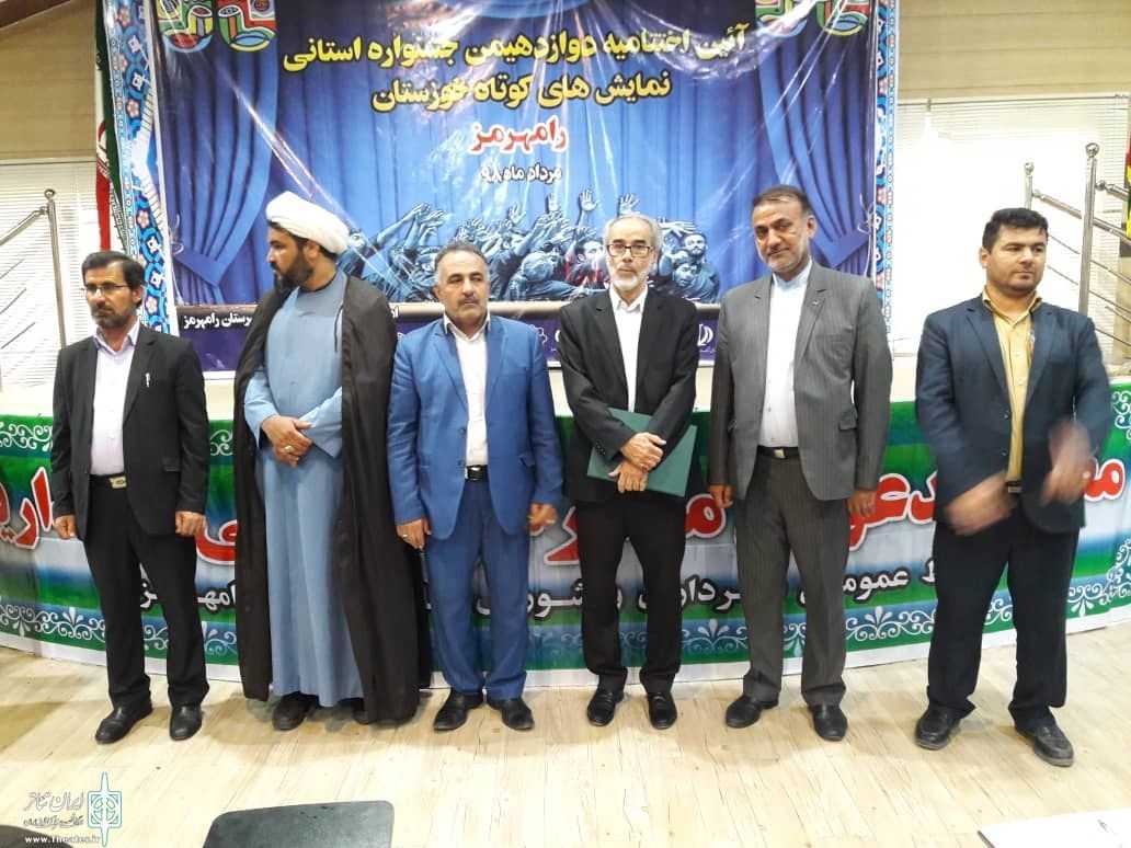 به گزارش پایگاه خبری ایرانیان ، آیین پایانی دوازدهمین جشنواره استانی نمایش های کوتاه استان خوزستان در شهرستان رامهرمز با حضور محمد جوروند مدیر کل فرهنگ و ارشاد اسلامی خوزستان، موسی ممبینی فرماندار رامهرمز، رستمی مدیریت آموزش و پرورش رامهرمز، حجت الاسلام عسکرزاده رئیس سازمان تبلیغات اسلامی رامهرمز، حجت الاسلام روحیانی نژاد رئیس اداره اوقاف رامهرمز، ذوالفقاری، سالاروند و شکوریان هیئت داوران جشنواره، ناصر آریانی نیا معاونت هنری سینمایی اداره کل فرهنگ و ارشاد اسلامی خوزستان، محمد یاقوت پور رئیس انجمن هنرهای نمایشی استان خوزستان و هنرمندان تئاتر گروه های شرکت کننده در جشنواره روز سه شنبه ۲۲ مردادماه ۹۸ در تالار شهرداری رامهرمز برگزار شد و با رای هیات داوران هنرمندان مسجدسلیمان به شرح زیر در چند بخش موفق به کسب مقام شدند و در تیم منتخب استان خوزستان جهت شرکت در سیزدهمین جشنواره سراسری تئاتر کوتاه ارسباران آذربایجانشرقی قرار گرفتند که به شرح زیر میباشد.