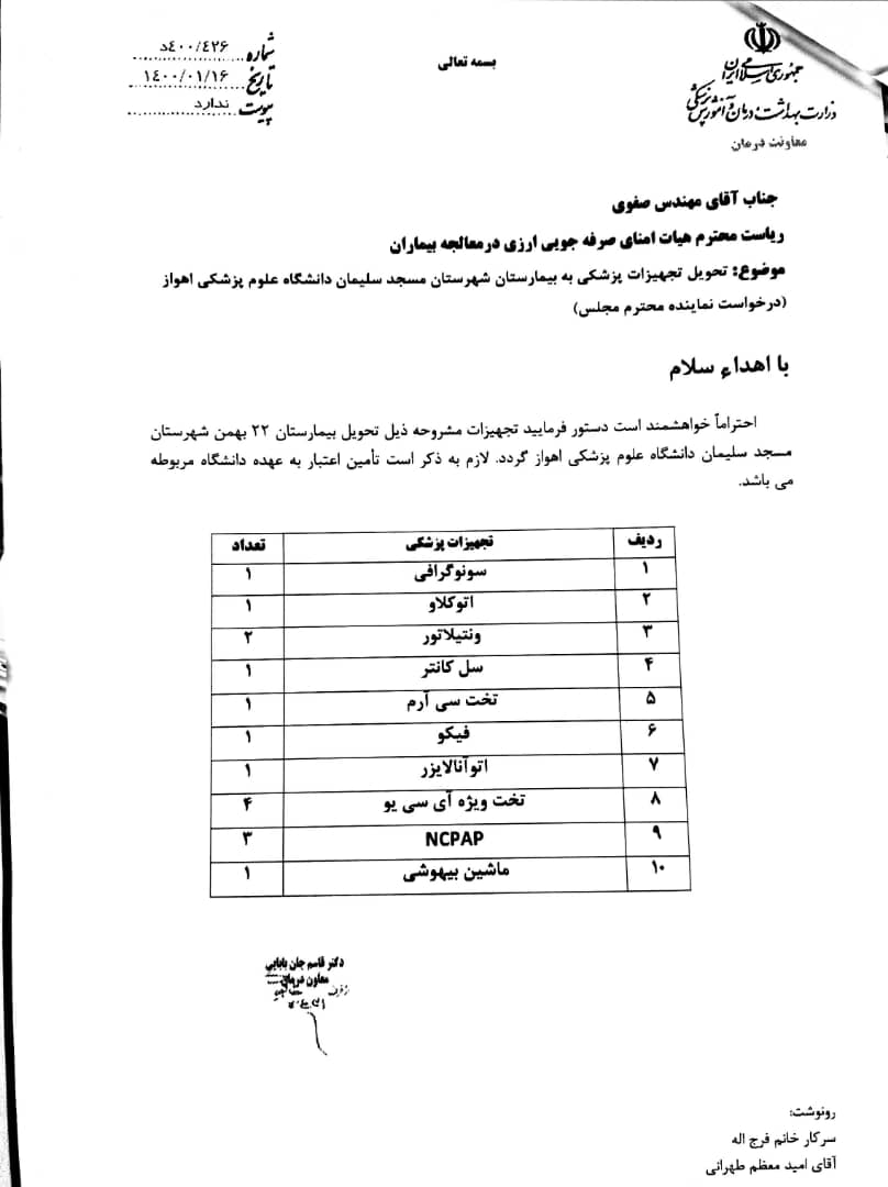 به گزارش پایگاه خبری ایرانیان به نقل از روابط عمومی نماینده مردم شهرستان های مسجدسلیمان، لالی، هفتکل و اندیکا در مجلس شورای اسلامی، طی مکاتبه ای از سوی معاونت درمانی وزارت بهداشت و درمان، تحویل تجهیزات پزشکی به شبکه بهداشت و درمان شهرستان های مسجدسلیمان، لالی و هفتکل اعلام شد.