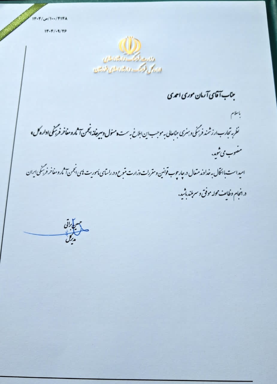 با حکم مدیرکل فرهنگ و ارشاد اسلامی استان خوزستان، آرمان موری احمدی شاعر، محقق و نویسنده بختیاری به عنوان مسئول دبیرخانه انجمن آثار و مفاخر فرهنگی اداره کل فرهنگ و ارشاد اسلامی استان خوزستان منصوب شد.