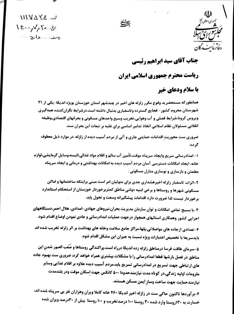 بر اساس این گزارش ، مجمع نمایندگان استان خوزستان طی مکاتبه ای خطاب به آیت الله رئیسی ، در ۸ محور خواستار اقدامات حمایتی دولت جهت رفع مشکلات مردم آسیب دیده از زلزله شهرستان اندیکا شدند.